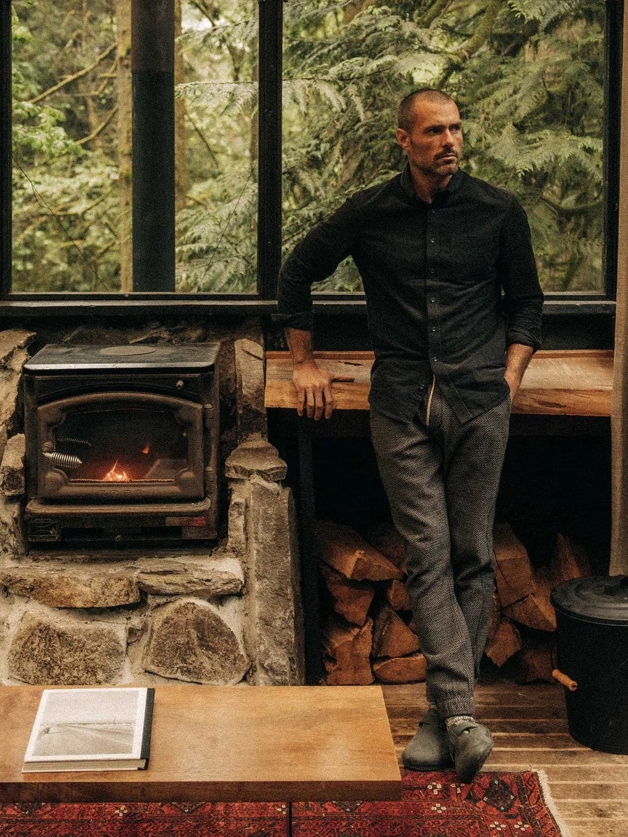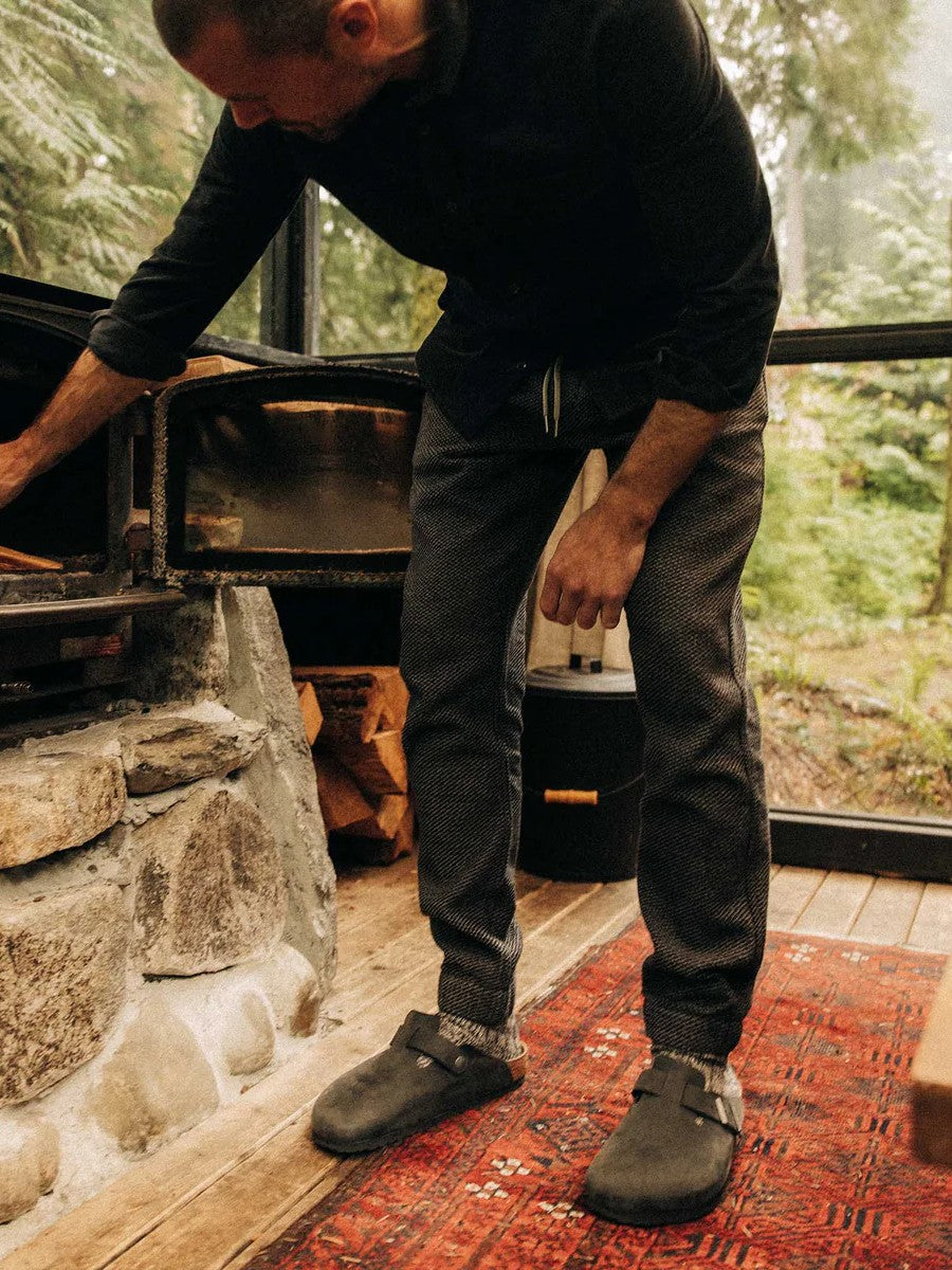 This 100% organic Sashiko-woven cotton boasts some truly stellar texture, and at 8-oz. it's burly enough to take on the stresses of everyday wear. This handsome charcoal finish really emphasizes the unique intricacies of the weave, and for a comfort boost, we’ve given it a softening wash. Per tradition, this edition of The Après Pant features dark horn buttons, a convenient elastic waistband, and our signature SF map print pocketing.