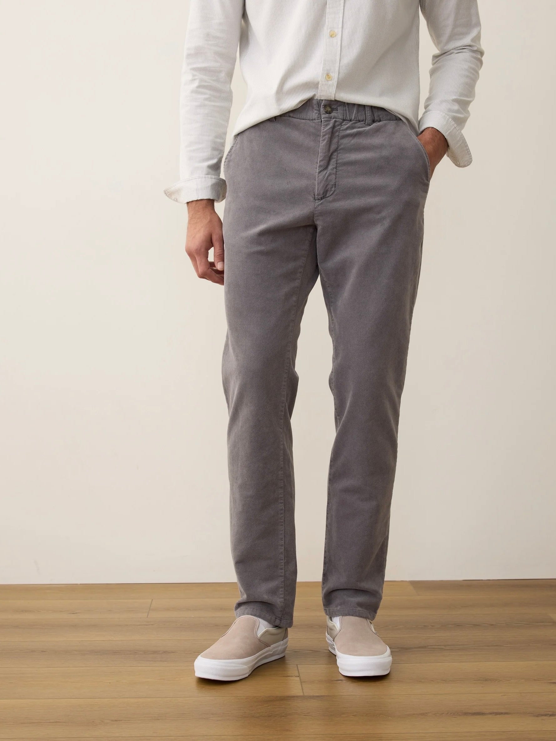 This moleskin fabric has the ultra soft feel of corduroy, but without the ribbed texture. And thanks to a solid 3% spandex, it's amazingly stretchy. Just like a Saturday pant should be.