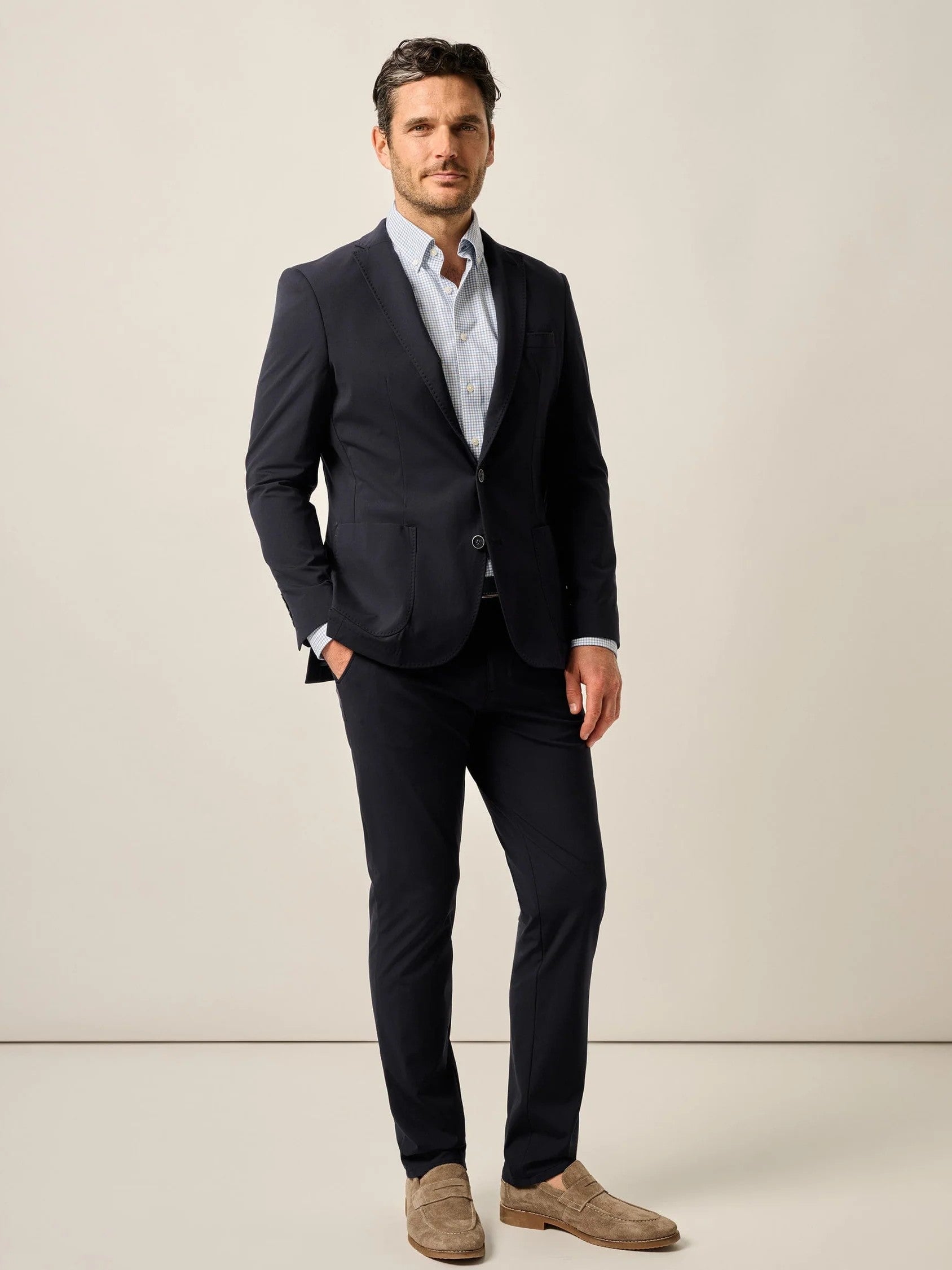The Hoffman Performance Stretch Knit Blazer is the cornerstone of a modern suit. Cut with our signature Johnnie-O fit—tailored but never tight—and crafted from a breathable blend with just the right amount of stretch for all-day comfort and extra mobility (especially when it’s time to hit the dance floor). If comfort and style are non-negotiable, this is the one suit your closet needs.