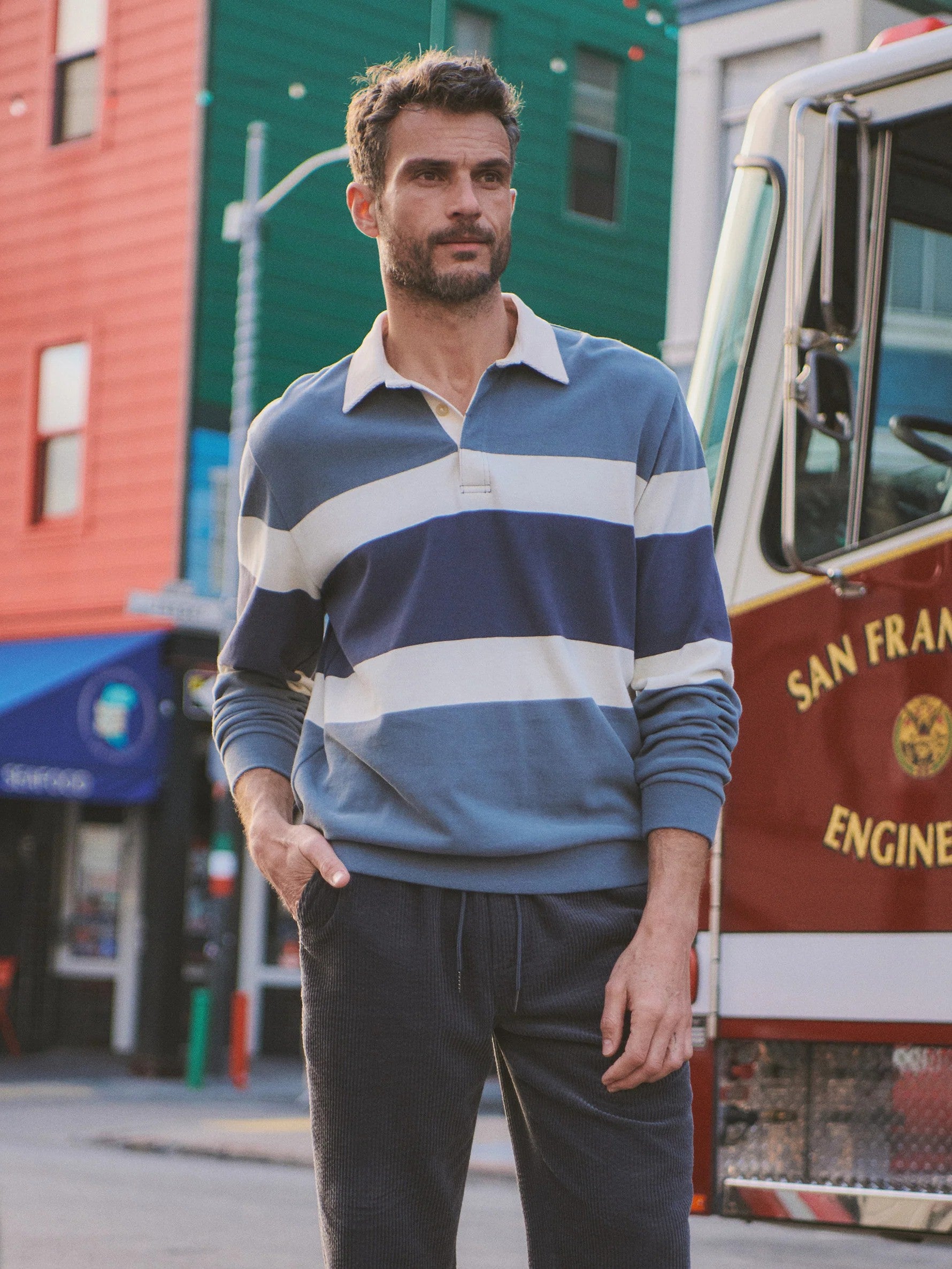 The classic rugby shirt needed a little update. So we took on the job. We upgraded the fabric and feel for today—gave it a heavyweight fabric that's warm enough to wear between seasons, and a fit that actually lets you move around. And as for the stripes? Well, we just like stripes.